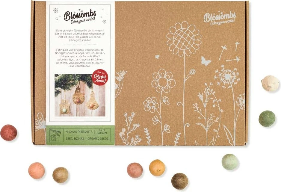 Bloem ‘bommetjes’, verpakt als leuke cadeautjes. In de Blossombs zit een biologische wilde bloemenzaadmix. Deze bestaat o.a. uit de volgende bloemzaden: Phacelia, vlas, gele mosterd, koriander, vlasdotter, kaasjeskruid, klaproos, bolderik, korenbloem, kamille, Perzische klaver, inkarnaatklaver, Alexandrijnse klaver. Sommige zaadjes komen meteen aan het begin van het seizoen op (mrt/apr), andere pas aan het eind (sep/okt), daardoor heb je eigenlijk met 1 Blossomb het hele seizoen bloemen! Deze bloemmengsels geven kleur aan uw tuin en zijn voedsel voor vlinders, bijen en hommels. Ze worden op een duurzame manier in eigen land geproduceerd en zijn gemaakt van 100% natuurlijke ingrediënten en biologische, wilde bloemzaden. Ook de verpakkingen zijn van duurzame en/of gerecyclede materialen.