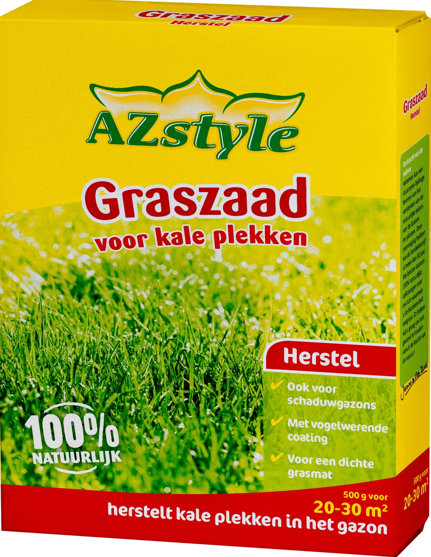 Indien er mos aanwezig is, het gazon maaien (maaihoogte 3 – 3,5 cm) en daarna verticuteren. Kale plekken met een hark losmaken, egaliseren en water geven. Daarna de kale plekken en beschadigde delen in het gazon inzaaien met Graszaad-Herstel. Verdeel het graszaad in twee gelijke hoeveelheden. Zaai één deel in de lengte en het andere deel in de breedte van de in te zaaien kale plekken. Het graszaad voorzichtig en niet te diep inharken. Na het inharken het graszaad licht aandrukken, dit bevordert het ontkiemen van het graszaad.