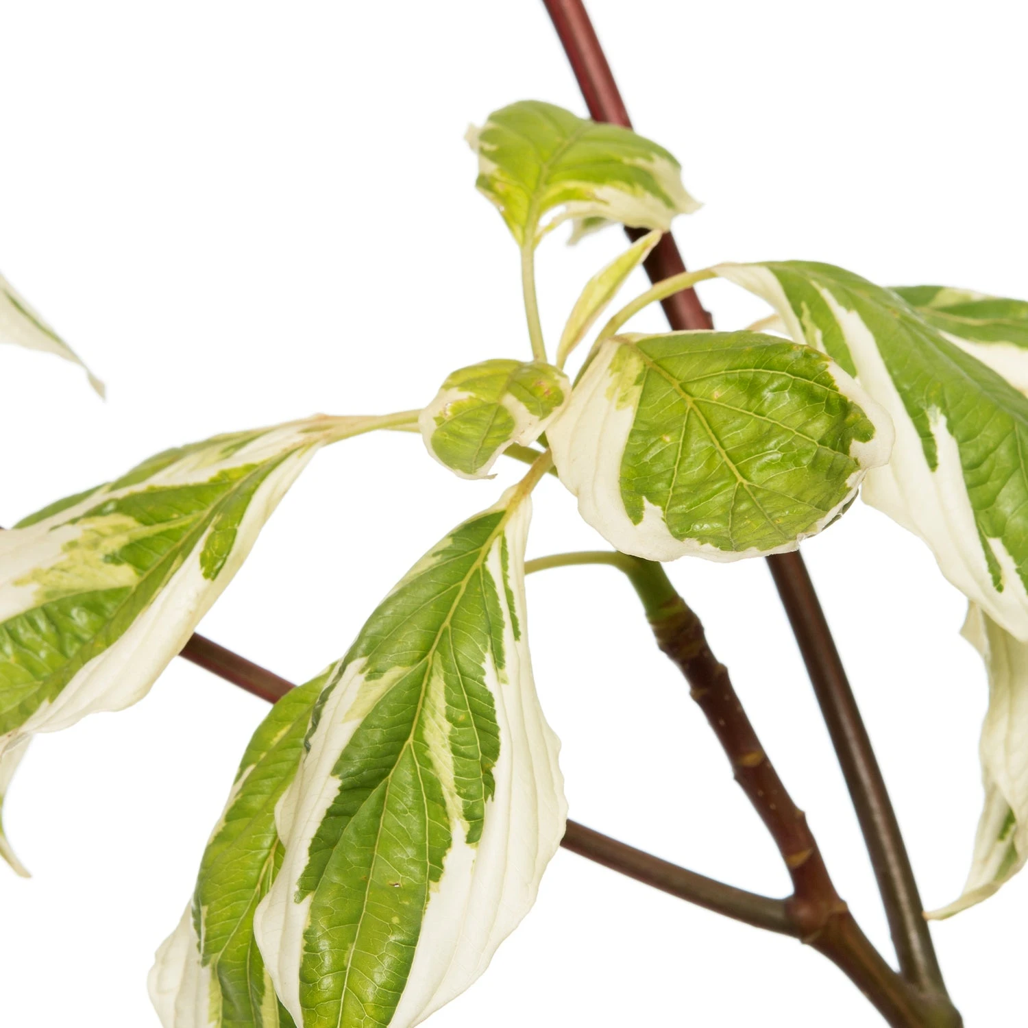 De kornoelje staat in Nederland vooral bekend voor zijn kleurrijke takken: in het rood, geel, groen tot zelfs oranje. Dit soort heeft deze kleurenpracht niet maar heeft witbonte bladeren die in een soort gelaagdheid groeit. In verschillende etage groeit de plant omhoog. De bloemen zijn wit en stervormig.